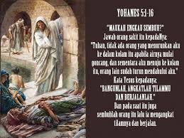 Kita lihat orang buta itu disembuhkan, tidak melalui air kolam berguncang tetapi Yesus yang menyembuhkannya.