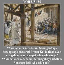 Yesus berkata pada orang-orang Yahudi: Sesungguhnya barangsiapa menuruti FirmanKu, ia tidak akan mengalami maut sampai selama-lamanya tetapi mereka menjawab: Adakah Engkau lebih besar dari pada bapa kita Abraham, yang telah mati! Nabi-nabipun telah mati; dengan siapakah Engkau samakan diriMu?