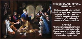 Dari bacaan Injil hari ini, maknanya kita merenungkan bagaimana Maria tulus hati meminyaki kaki Yesus lalu menyekanya dengan rambutnya dengan minyak yang mahal harganya yakni minyak narwastu murni yang semerbak wanginya.