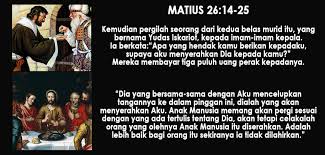 Kemudian pergilah seorang dari kedua belas murid itu, yang bernama Yudas Iskariot, kepada imam-imam kepala. Ia berkata: “Apa yang hendak kamu berikan kepadaku, supaya aku menyerahkan Dia kepada kamu?” Mereka membayar tiga puluh uang perak kepadanya. Dan mulai saat itu ia mencari kesempatan yang baik untuk menyerahkan Yesus.