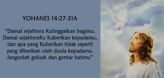 Damai sejahtera Kutinggalkan bagimu. Damai sejahteraKu Kuberikan kepadamu, dan apa yang Kuberikan tidak seperti yang diberikan oleh dunia kepadamu. Janganlah gelisah dan gentar hatimu.