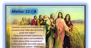 Pada waktu itu, pada hari Sabat, Yesus berjalan di ladang gandum. Karena lapar, murid-muridNya memetik bulir gandum dan memakannya. Melihat itu, berkatalah orang-orang Farisi kepadaNya: “Lihatlah, murid-muridMu berbuat sesuatu yang tidak diperbolehkan pada hari Sabat.”