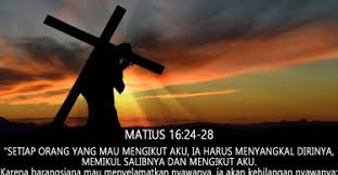 Yesus berkata kepada murid-muridNya: “Setiap orang yang mau mengikut Aku, ia harus menyangkal dirinya, memikul salibnya dan mengikut Aku.