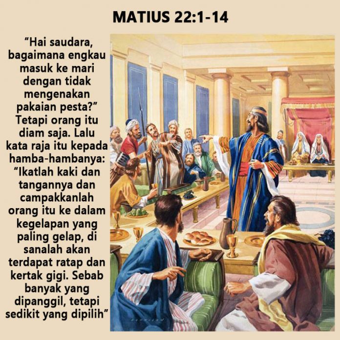 Ketika raja itu masuk untuk bertemu dengan tamu-tamu itu, ia melihat seorang yang tidak berpakaian pesta. Ia berkata kepadanya: Hai saudara, bagaimana engkau masuk ke mari dengan tidak mengenakan pakaian pesta? Tetapi orang itu diam saja.
