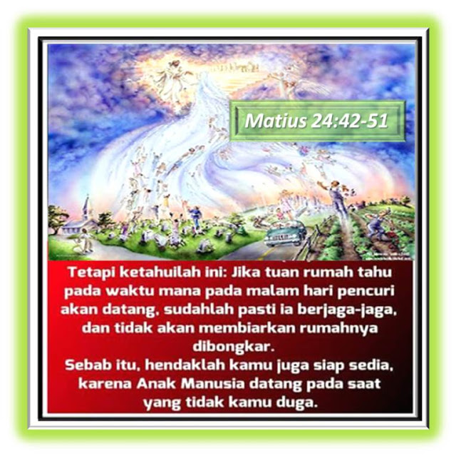 Karena itu berjaga-jagalah, sebab kamu tidak tahu pada hari mana Tuhanmu datang. Sebab itu, hendaklah kamu juga siap sedia, karena Anak Manusia datang pada saat yang tidak kamu duga.