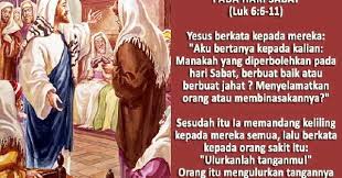 Lalu Yesus berkata kepada mereka: “Aku bertanya kepada kamu: Manakah yang diperbolehkan pada hari Sabat, berbuat baik atau berbuat jahat, menyelamatkan nyawa orang atau membinasakannya?”