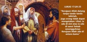 Atas pertanyaan orang-orang Farisi, apabila Kerajaan Allah akan datang, Yesus menjawab, kataNya: “Kerajaan Allah datang tanpa tanda-tanda lahiriah